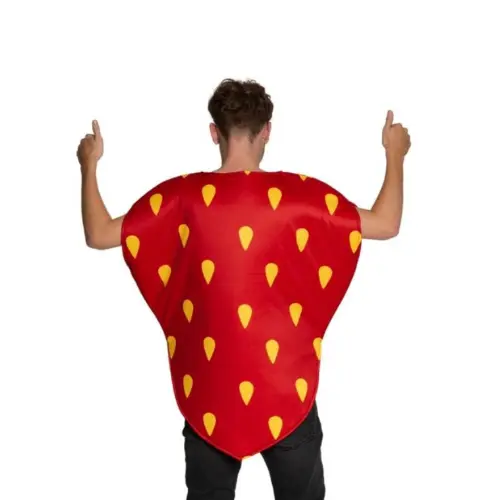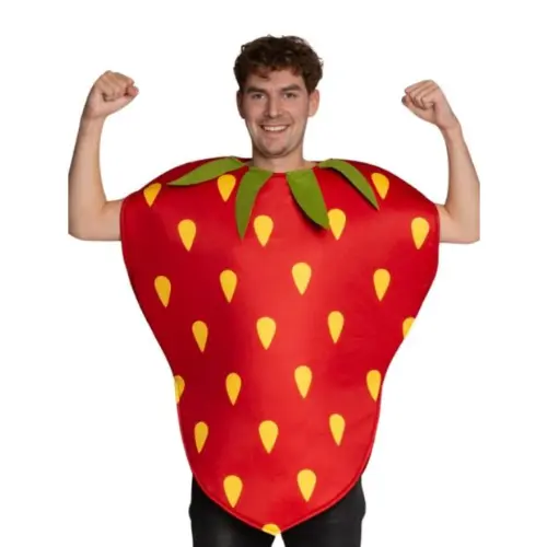 Val lekker op in dit zoete Aardbei kostuum in one size. De outfit heeft de vorm van een grote, rode aardbei met groene details en trek je eenvoudig over je eigen kleding aan.