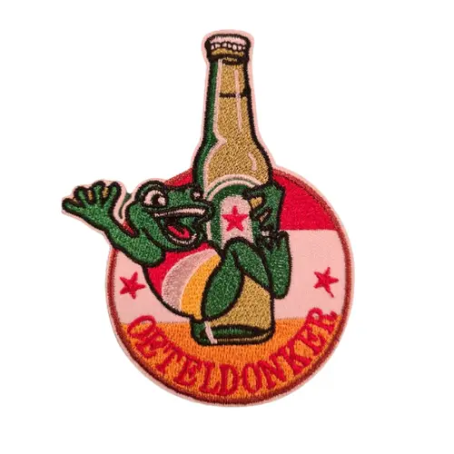 Strijkembleem/applicatie, carnaval kikker op bierfles – Oeteldonk