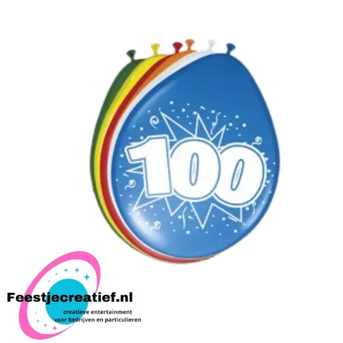 Ballonnen in verschillende kleuren met het getal 100 erop. Per 8 stuks verpakt. De ballonnen zijn 30 centimeter (12 inch) groot.
