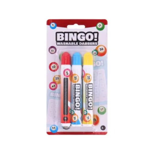 Bingo stiften 3 stuks. 3 Bingo Dabbers met een diameter van 10 mm. Rood, geel, en blauw. Elke stift bevat 20 ml. Wasbaar. Geschikt voor kinderen vanaf 3 jaar.