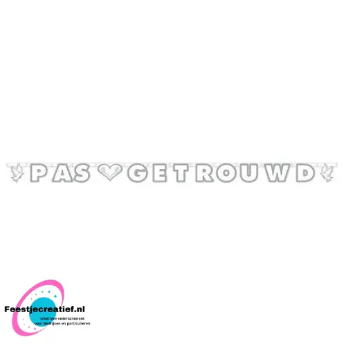Wit met zilveren letterslinger “pas getrouwd”. De slinger is 2,10 meter lang.