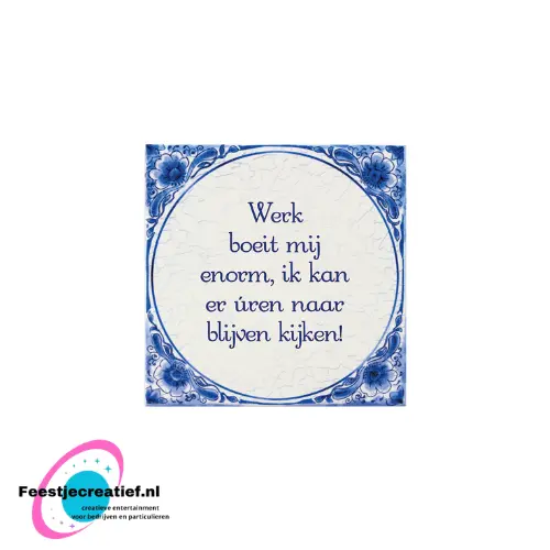 Voeg een vleugje humor en authenticiteit toe aan je werkruimte met ons unieke Delfts blauw tegeltje met de tekst “Werk boeit mij enorm, ik kan er uren naar kijken”. Dit traditionele Nederlandse tegeltje is met zorg vervaardigd en weerspiegelt de iconische stijl van Delfts blauw aardewerk.