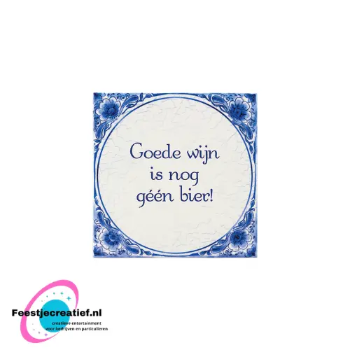 Breng een humoristische touch aan je interieur met ons unieke Delfts blauw tegeltje ‘Goede Wijn is Nog Geen Bier!’. Dit authentieke Nederlandse tegeltje is met zorg vervaardigd en weerspiegelt de iconische charme van Delfts blauw aardewerk.