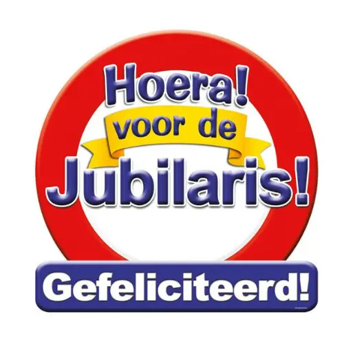 Kartonnen deurbord/verkeersbord “hoera voor de Jubilaris”. Het deurbord is ongeveer 50×50 centimeter.