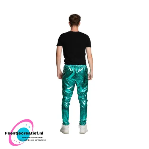 Val extra op op de dansvloer met deze turquoise disco broek . De glanzende polyester stof en vrolijke kleur geven je direct een echte retro 70’s/80’s discolook. Perfect voor themafeesten, carnaval, foute party’s en verkleedavonden.