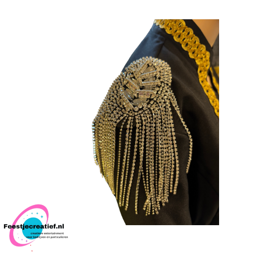 Deze luxe bling-bling epauletten (1 stuks) maken je jas echt helemaal af. De epauletten zijn rijk voorzien van schitterende steentjes en goudkleurige kettinkjes. De epauletten zijn gemakkelijk te bevestigen met de dubbele spelden die aan de onderzijde zitten.