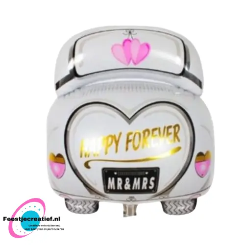Folieballon in de vorm van een roze trouwauto. Op de trouwauto staat de tekst "Happy forever". De folieballon is ongeveer 63x50 centimeter groot.