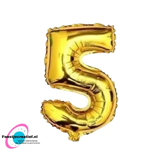 Gouden folieballon in de vorm van een 5. Ongeveer 40 centimeter groot (16 inch).