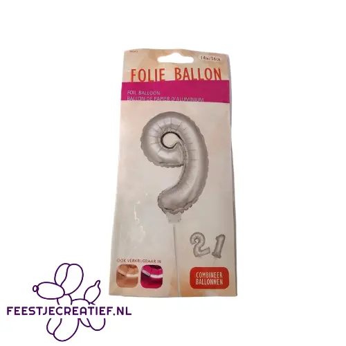 Zilverkleurige folieballon van het cijfer 9, bijgeleverd met een stokje. De folieballon is ongeveer 36 centimeter groot wanneer opgeblazen. De folieballon kan enkel met lucht worden opgeblazen; niet geschikt voor helium.