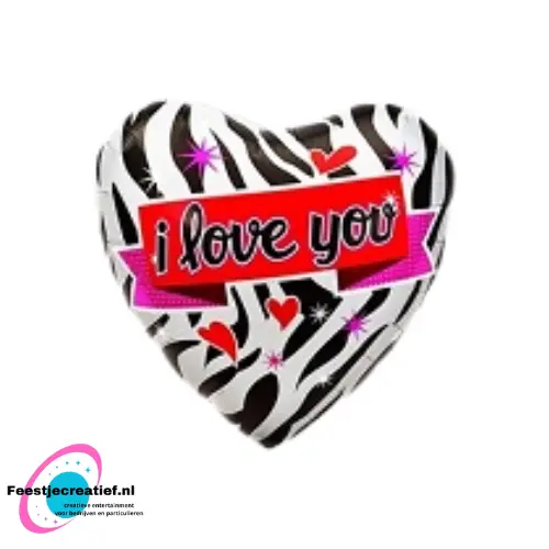 Hartvormige folieballon met de tekst "I love you" in zebrastijl. De folieballon is ongeveer 40 centimeter groot.