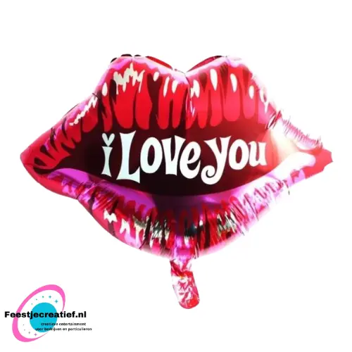 Folieballon in de vorm van een kus, waarin in het midden de tekst "I love you" staat. De folieballon is ongeveer 58x51 centimeter groot.