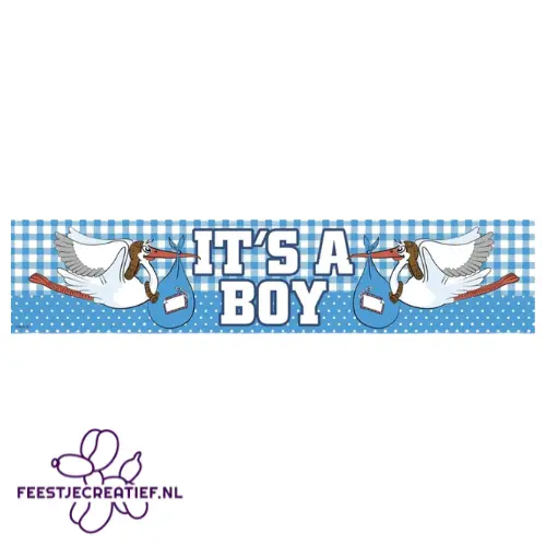 Kondig de geboorte van een zoontje aan met deze blauwe banier. Deze foliebanier van 2,5 meter heeft een afbeelding van een ooievaar en de tekst it's a boy.