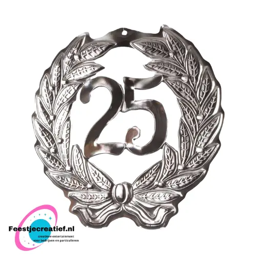 Zilveren huldeschild met het getal 25 in het midden. Afmetingen: ca. 40×40 centimeter.