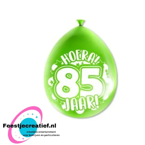 Ballonnen in verschillende kleuren met “Hoera! 85 jaar!” erop, 8 stuks. De ballonnen zijn 30 centimeter groot.