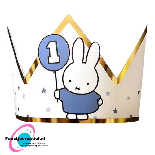 Maak de allereerste verjaardag extra speciaal met dit schattige Nijntje kroontje in babyblauw. Het kroontje is versierd met Nijntje en een grote “1”, speciaal voor jarige job of jarige jet die 1 jaar wordt. Perfect voor een cake smash, fotoshoot of verjaardagstaartmoment.
