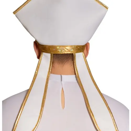 De set is geïnspireerd op de traditionele pauselijke outfit en zorgt direct voor een herkenbare en opvallende look.