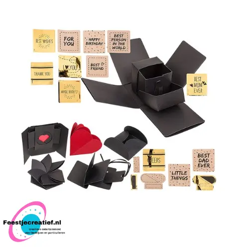 Met de Photo surprise box/scrapbookgeef je jouw geliefde, vriend(in) of iemand anders die je dierbaar is een onvergetelijk cadeau. Vul de Explosie Foto Doos met prachtige foto's van de mooiste herinneringen. Door het bouwpakket zelf in elkaar te zetten en zelf de foto's uit te kiezen kun je hem helemaal naar eigen smaak ontwerpen. In het midden is ruimte voor een klein cadeautje.