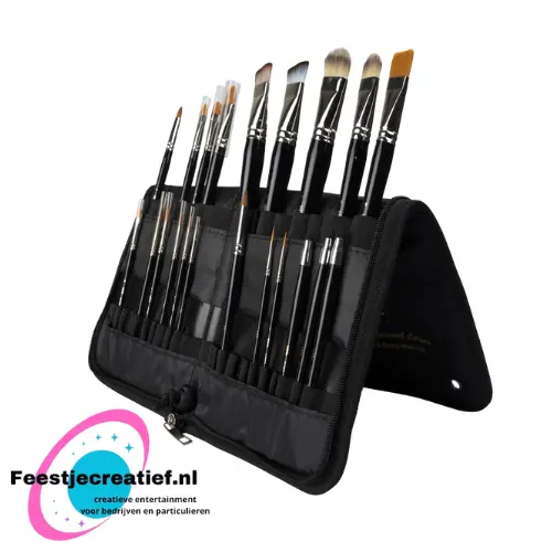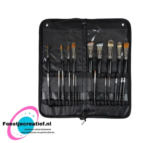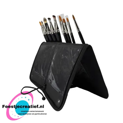 De onderste laag heeft plaats voor 22 penselen en de bovenste laag heeft plaats voor 12 grotere penselen. Met een plastic beschermlaag die tevens als vakje voor sjablonen kan worden gebruikt.