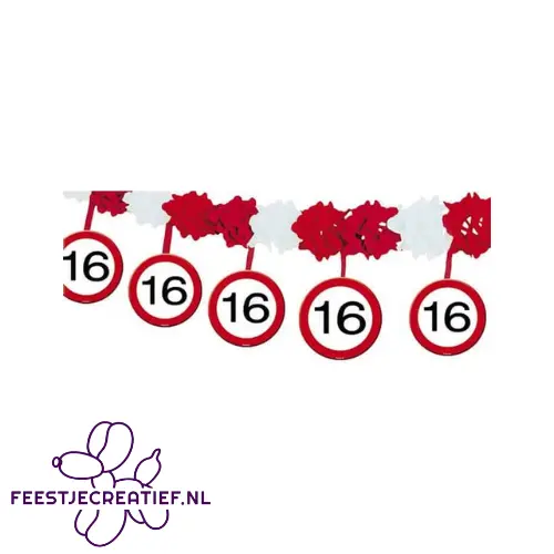 Slinger met onderhangers in de vorm van verkeersborden met het getal 16 erop. De lengte van de slinger is ca. 4 meter.