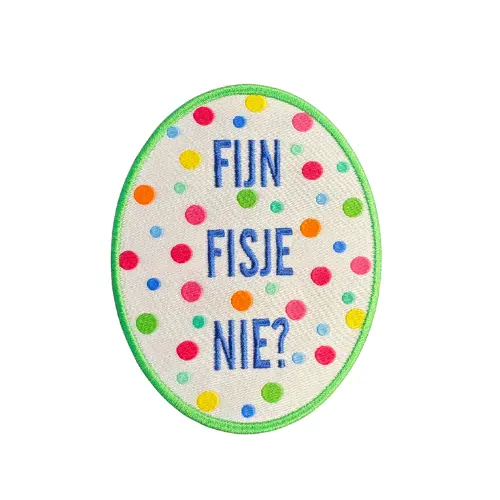 Breng de feeststemming erin met dit gezellige strijkembleem “Fijn fisje nie?” met vrolijke confetti. Met een formaat van 8 cm is het embleem perfect zichtbaar op je carnavalskiel, jas, trui, T-shirt of tas.
