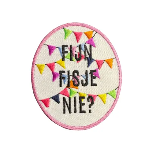 Breng de feeststemming erin met dit gezellige strijkembleem “Fijn fisje nie?” met vrolijke vlaggenlijn. Met een formaat van 8 cm is het embleem perfect zichtbaar op je carnavalskiel, jas, trui, T-shirt of tas.