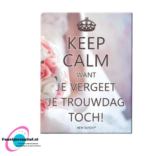 Dit tegeltje is ontzettend leuk om te geven wanneer iemand gaat trouwen. Op het tegeltje staat de tekst "Keep calm want je vergeet je trouwdag toch!". De lengte van het tegeltje is 16 centimeter en de breedte 12 centimeter.