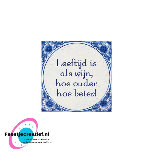 Voor iedereen die met de jaren alleen maar beter (of in elk geval gezelliger) wordt. Dit Delfts blauwe tegeltje met de tekst “Leeftijd is als wijn” is het perfecte cadeau voor een verjaardag, jubileum of zomaar – met een knipoog naar ouder worden.