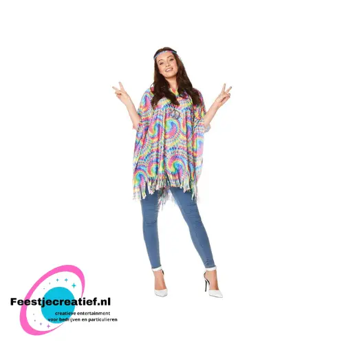 Geef je outfit direct een vrolijke, boho uitstraling met deze kleurrijke Tie Dye poncho. De speelse print en het lichte polyester maken hem perfect voor festivals, themafeesten, stranddagen of gewoon als opvallende eyecatcher op een frisse dag. One size, dus makkelijk over je kleding heen te dragen.