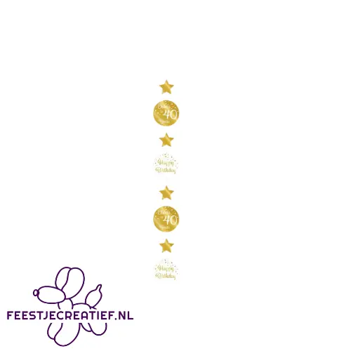 - Inhoud: één hangdecoratie met 2 witte bordjes met de tekst "Happy Birthday" en 2 goudkleurige bordjes met de tekst "Cheers to 40 years"